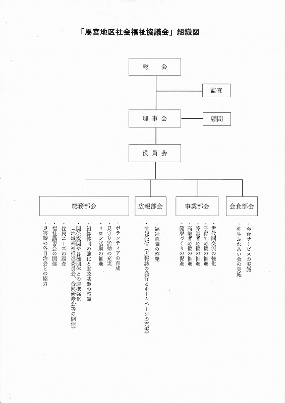 活動の拠点として馬宮コミュニティーセンター内に事務所を置き、さいたま市社会福祉協議会の指導を頂きながら、地域の各自治会をはじめ、民生児童委員、各種団体と協働して、社会福祉を推進しています。