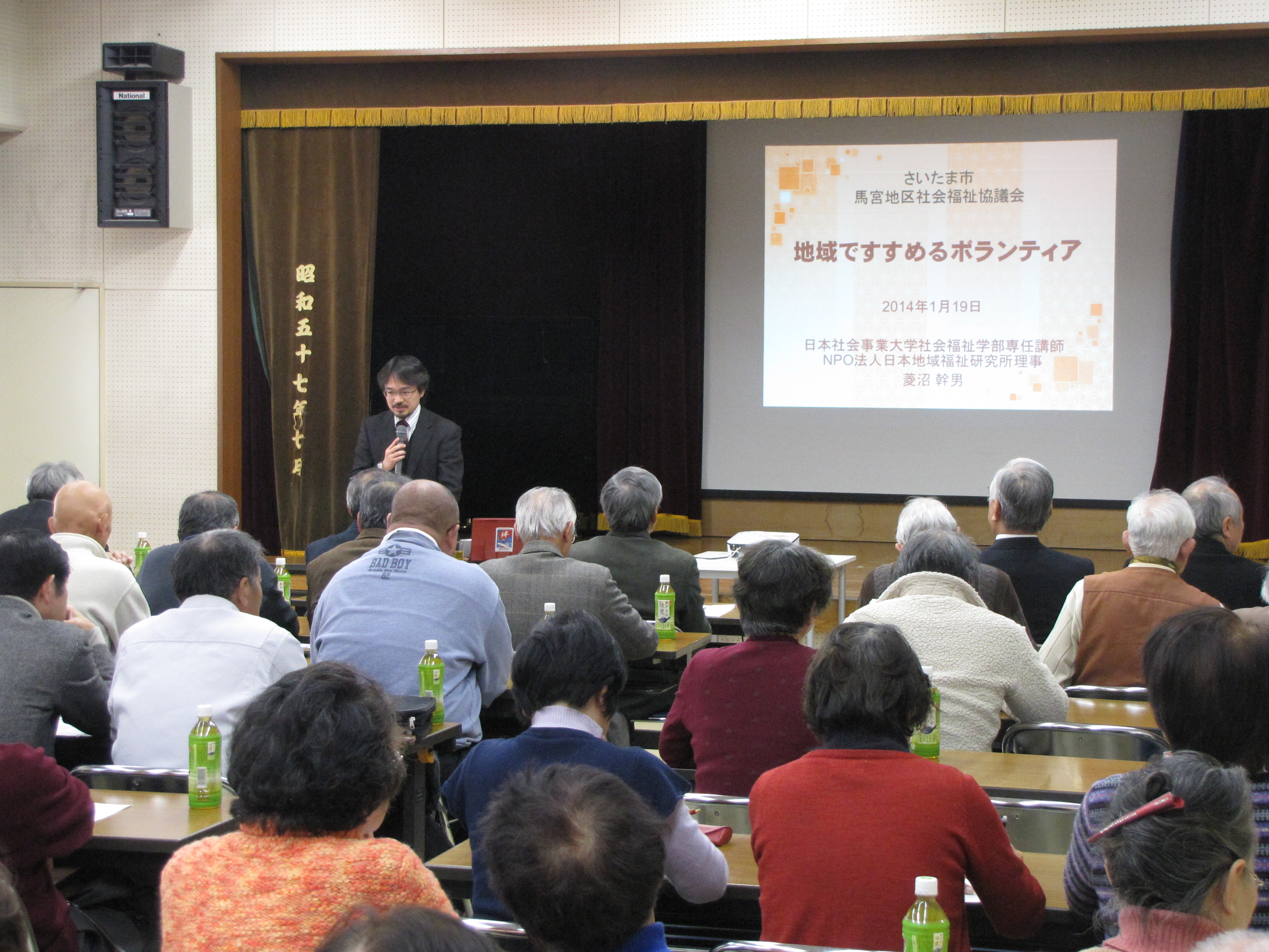 平成26年10月4日(土)、馬宮コミュニティセンターの第2〜4集会室において、ボランティアとは? 活動をしたいけど、どのように始めたらよいのか、きっかけがつかめない・・・また自分がどんなボランティアに向いているかわからないなど、各自治体の福祉委員をはじめ、ボランティアに関心のある地域住民52名が参加、先生の話に聞き入っていました。