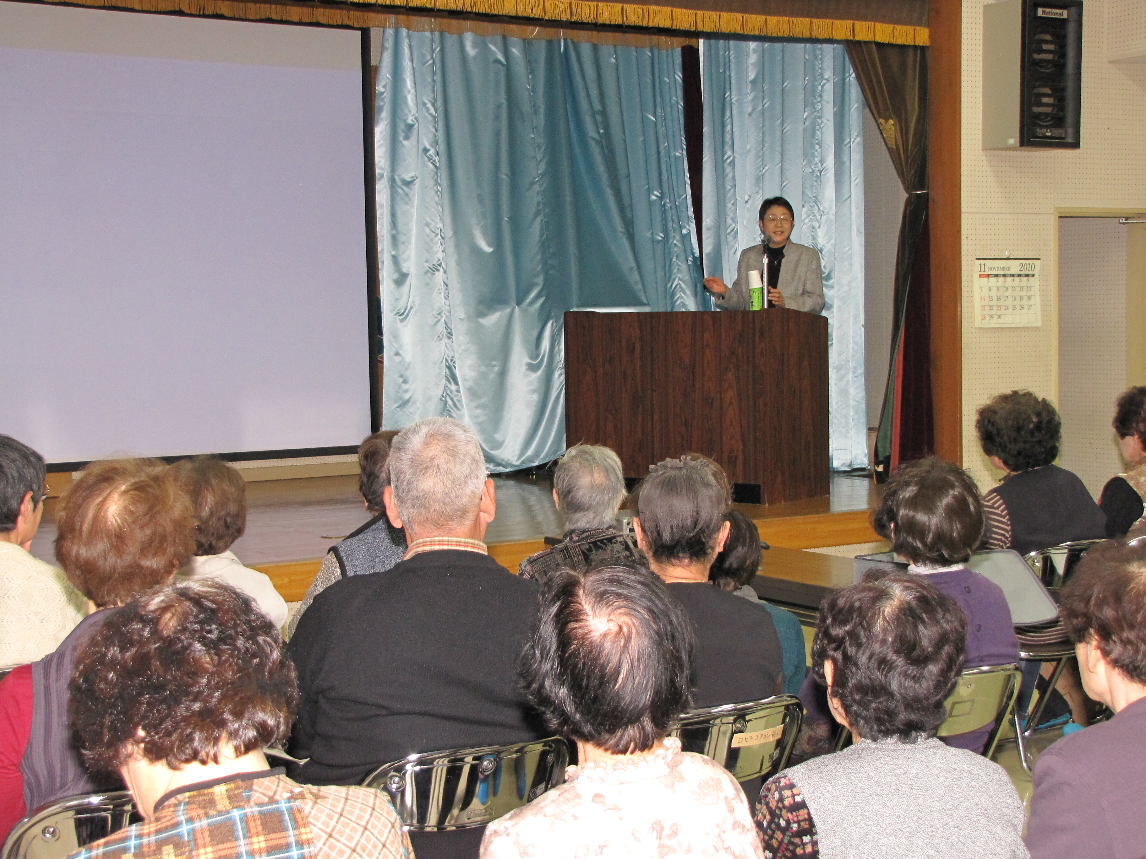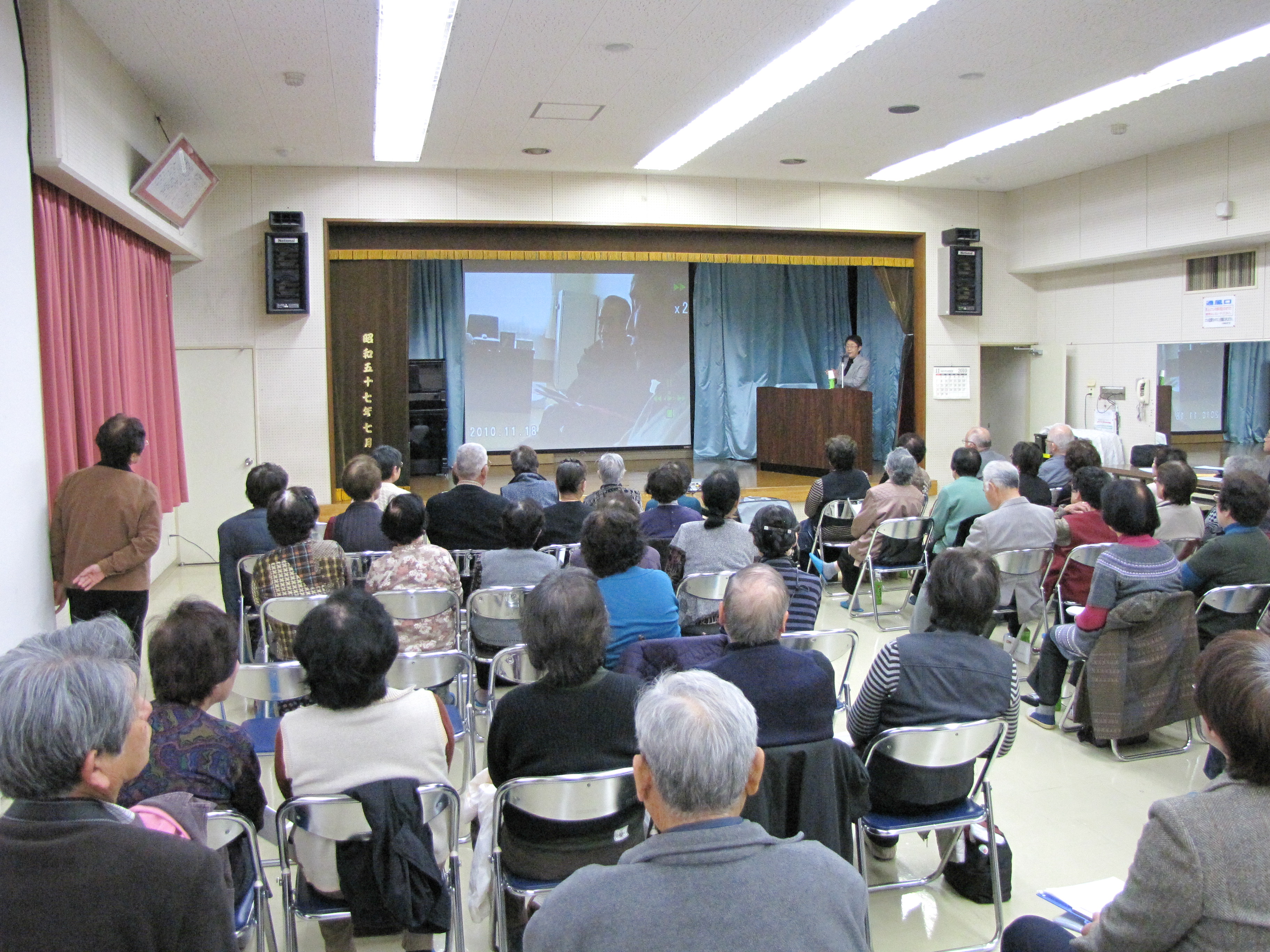 平成22年11月20日(土)、馬宮公民館レクホールにて、瀬田施設長さんの前向きな考え方や長年の経験談を聞かせていただきました。介護に対する不安や悩みなどを抱える70名ほどの地域の皆さんが参加、熱心にメモを取る姿が見られました。日々の介護に疲れ、もうどうにもならないギリギリのところで、預けられる本人は見捨てられた、家族は見捨てたという負い目の心で施設入所を希望する人が多い。 しかし、ホームは残された時を本人や家族が心穏やかに笑って過ごす、人生の終末期への新たなスタートの場所だと思って欲しい。我々スタッフも人生の終末期「臨終」に関わることの出来る最高の仕事だと考えていますと、本人・家族・スタッフそれぞれの違った立場からのお話に、胸のつかえが軽くなった人も少なからずいるのではないかと・・・。 「どんな施設でも課題はあります。 大切な家族を委ねるのですから、ホーム選びは慎重に、できるだけたくさんの施設に足を運び見学することをお勧めします。 その際、ホームのスタッフの言葉や態度より入居者の表情をよく観察するとよいですよ。 入所した方が幸せか否かは、時が経った時にその人の表情で判断するしかありませんから」。瀬田室長さんはそう言って締めくくられました。